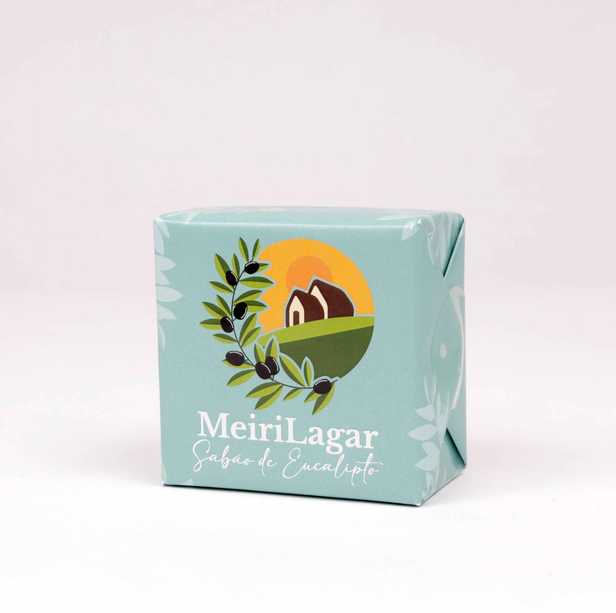 O sabão tradicional de azeite com óleo essencial de Eucalipto, embrulhado à mão, com uma temática alusiva ao Azeite: Azeite Portela, produzido na Meirilagar.